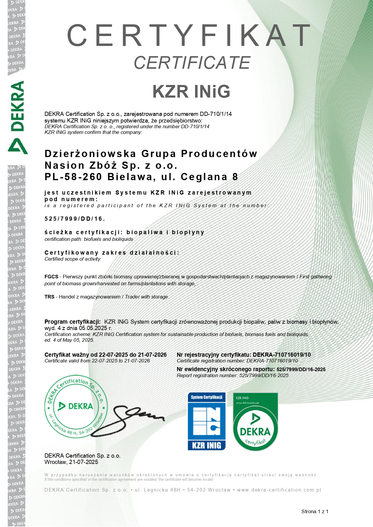 Szczycimy się posiadaniem, niezbędnych w obrocie płodami rolnymi, Certyfikatów KZR-INiG oraz GMP+